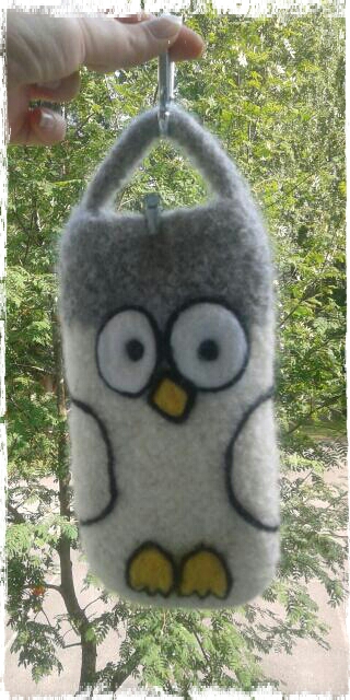 Virkkasin suurinpiirtein 2x isomman kännykkäpussin, kuin vanha Gollani. Pussi kun kutistui suurinpiirtein ohjeen mukaan 40% alkuperäisestä koostaan. Pyöräytin pussin Novitan ohjeen mukaan pesukoneessa. Pussi jäi harmikseni liian suureksi, joten pistin sen vielä uudestaan pyörimään, jolloin lopputulos oli melkein halutunkokoinen. Lopuksi kuivahuovutin pöllölle silmät ja nokan. Alkuperäisessä ohjeessa pöllölle oli virkattu vain silmät ja nokka, mutta miä vähän innostuin, ja tein viereen siivet ja jalat alle. Rautakaupasta sain metallisia ripustuslenkkejä ja nappasin verhonipsun pitämään suuaukkoa kiinni. Kokoa valmiille pöllölle tuli 10cm x 18cm ilman ripustuslenkkiä. Omaan älypuhelimeeni se on hieman iso, mutta se ei haittaa. Oon jo miettinyt uuden ostamista. Sen sijaan miehen Samsung Galaxy SIII:een se on oikein sopiva ;)